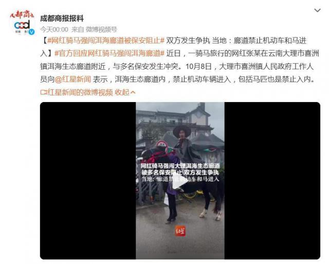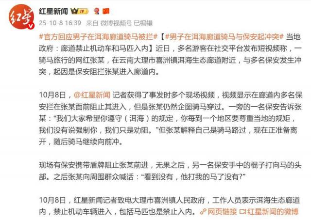 10 月 7 日,洱海生态廊道入口处,多名保安组成人墙阻拦张某骑马进入。一名保安现场喊话:"请尊重当地规定!"张某却声称"只是路过,马上离开",随后不顾劝阻骑马强闯。保安持盾牌阻挡无效后,一名保安用棍子击打马头,引发张某高呼"他打我的马了"。
