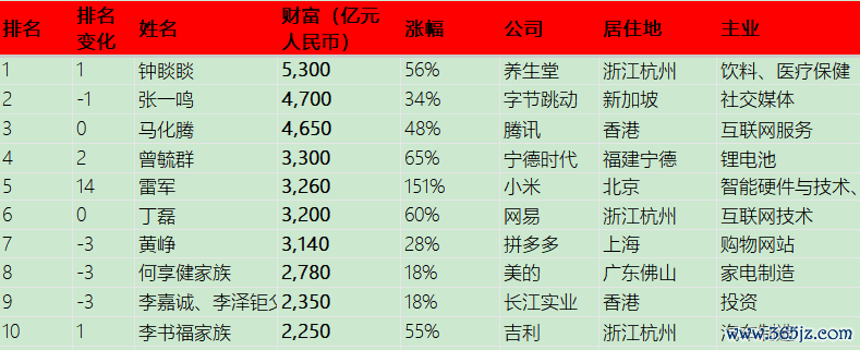 同时,60%的上榜企业家居住在10座城市,分别是上海、深圳、北京、香港、杭州、广州、台北、苏州、宁波、长沙。